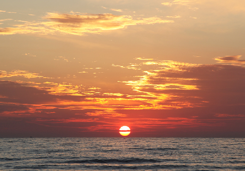 窓から見える夕陽と日本海を眺めながら、